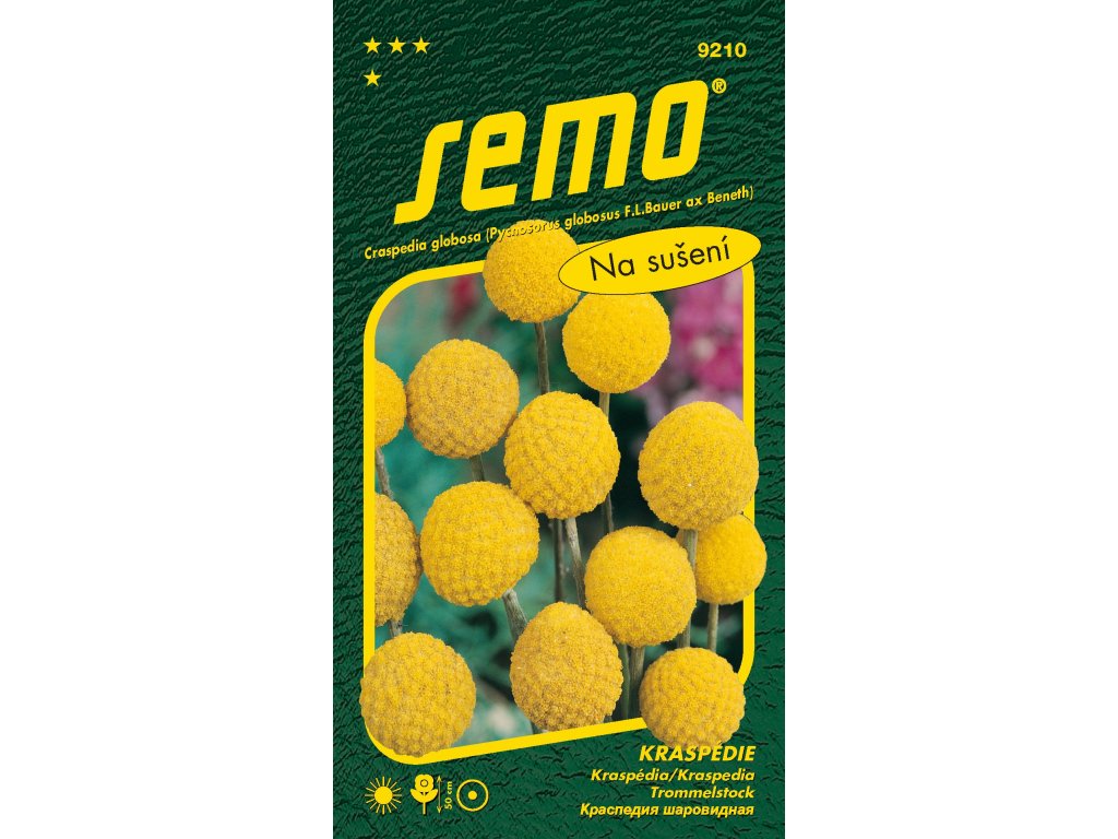 Letnička s přízemní růžicí listů a žlutými kulovitými květenstvími na vrcholu dlouhých stonků. Výborná do suchých i čerstvých vazeb. Má dlouhou vegetační dobu, vyséváme v lednu. Vyžaduje přímé slunce a záhřevnou lokalitu.Doplňkové parametry